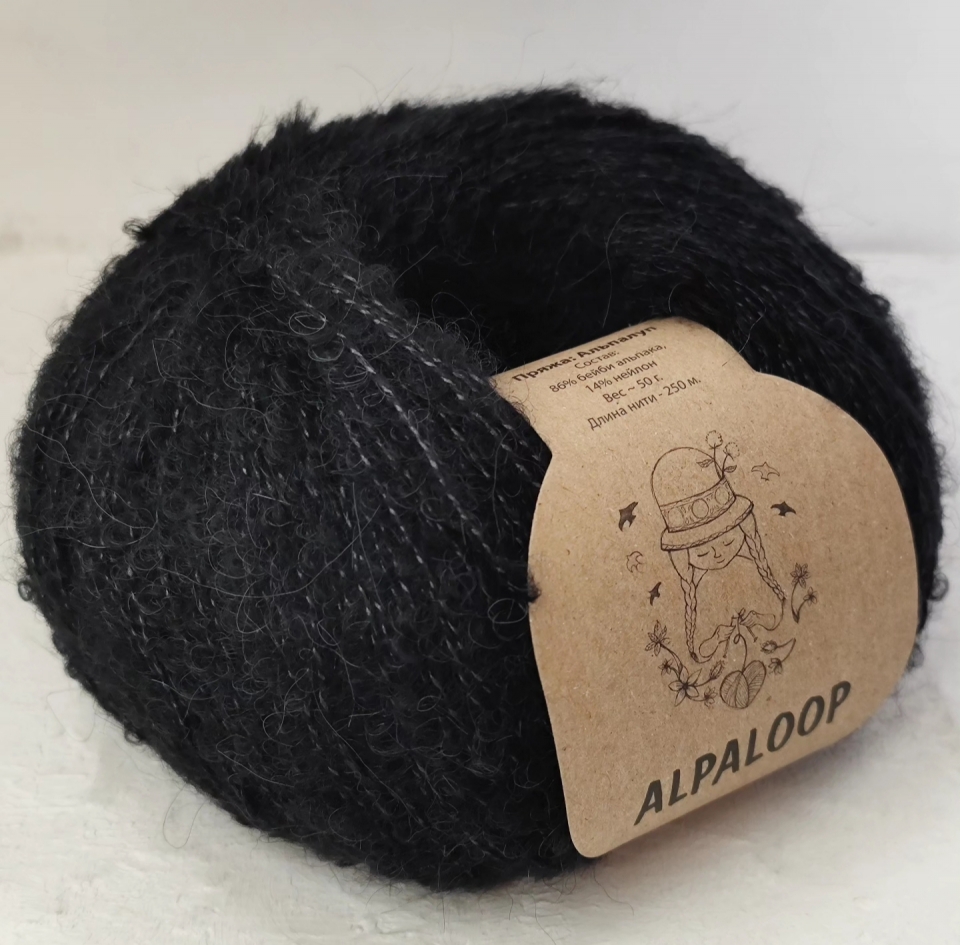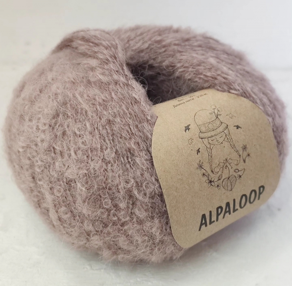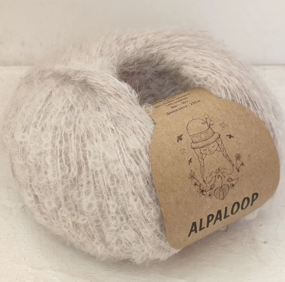 Пряжа букле Альпалуп (аналог пряжи сеам Альпалуп из Перу) произведена в Индии. В составе пряжи нежная, слегка пушистая бейби альпака, нейлон используется в качестве основы для прочности. Нить легкая, воздушная, теплая, не толстая, завитки букле среднего размера. Пряжа букле Альпалуп имеет метраж 250 м/50 г и может применяться в вязании как самостоятельная нить для легких и воздушных полотен (палантин, шаль, туника, паутинка), а при необходимости получить более плотное трикотажное полотно применима в качестве добавки к другим видам пряжи.